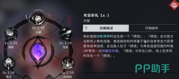 欢宴彩礼:这就是一个天赋技能,一旦在释放技能之后,马上就会形成一个绣球,而这个绣球和场上的角色也会连接,被连接的目标就可以获得普通攻击的倍率加成,而在被连接的范围内,敌人攻击力也可以降低15%左右,基本上每一秒全部都会受到伤害。