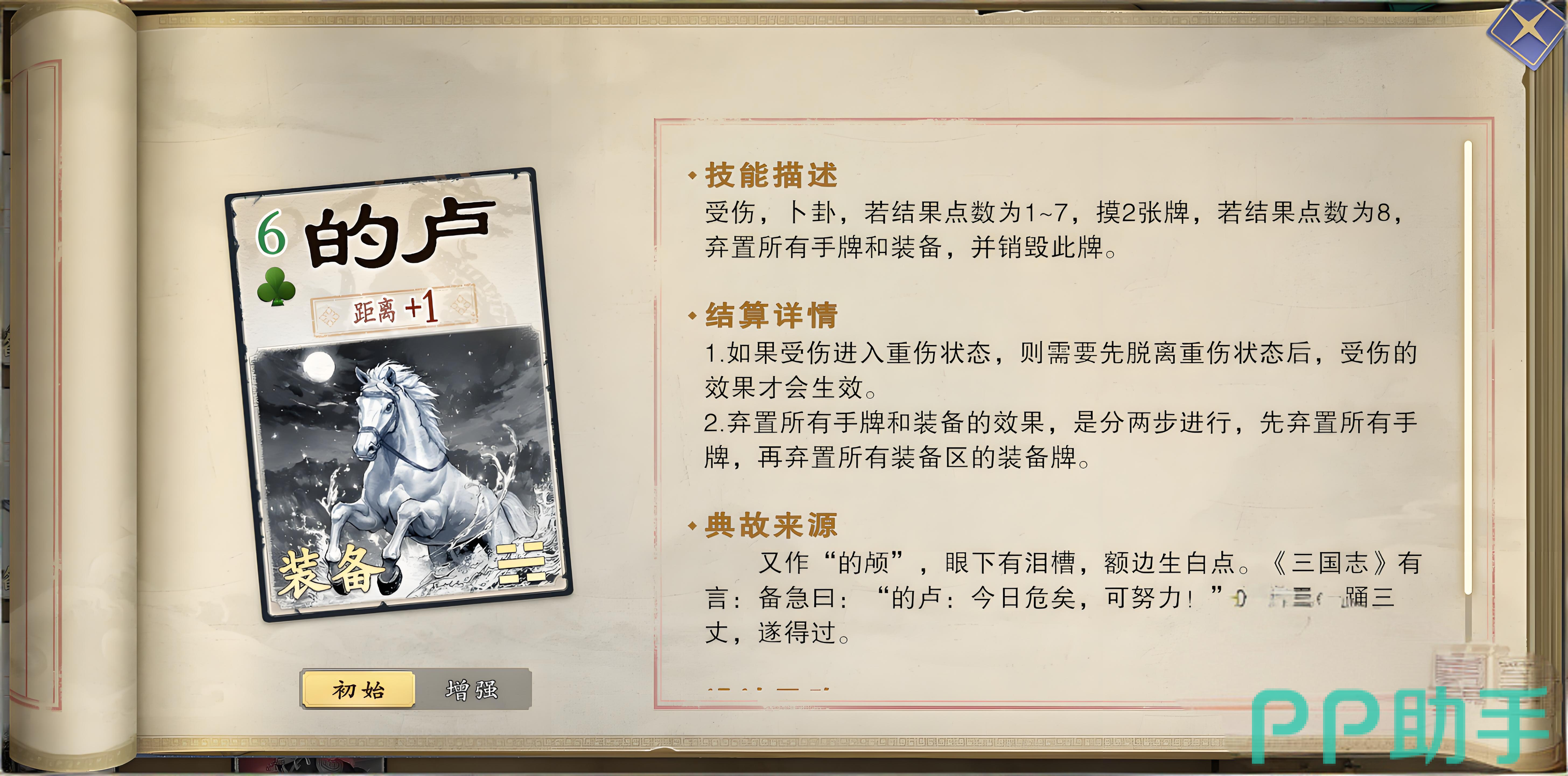 的卢是当前环境中防御能力最突出的坐骑之一,可大幅削弱敌方集火伤害。其特殊机制“卜卦”在受伤后自动触发:若掷出点数为1至7,则我方武将摸两张牌;若掷出点数为8,则强制弃置全部手牌与装备,并销毁的卢卡牌。该机制具有双面性,既可能带来资源补充,也可能引发严重负面效果,因此选用时需充分评估风险承受能力与卡组容错率。