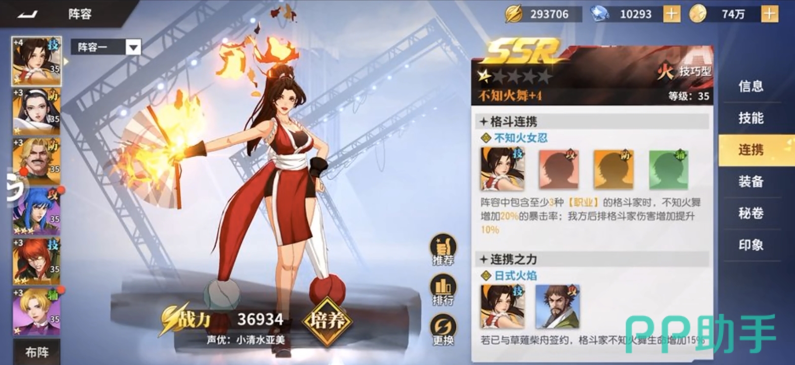首先为大家推荐的阵容是一个新手阵容。阵容主要角色有千鹤,琼以及不知火舞和玛丽。剩下的两个角色分别是麦卓和微丝。这个阵容的特点就是全员菜刀队,输出极其恐怖。并且不少角色都有自己的连击技能,玩起来非常爽快。