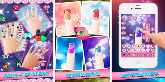 卡通的风格也适合所有年龄段的人群,这款游戏中并没有严格的要求,玩家可以天马行空发挥自己的想象力,为不同的指甲染上独具特色又漂亮的指甲油,在制作美甲时,也可以添上各种各样的装饰品,通过逐渐完成任务的方式解锁更多美丽的装饰品,这里涵盖了超过数10种不同的指甲形状,有方形,也有圆形。