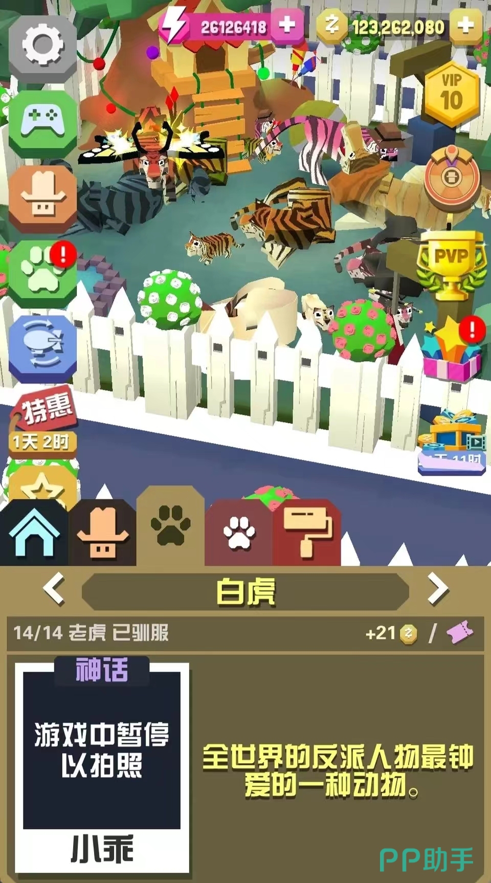 第五个是白虎,这也是在丛林里面玩家比较喜欢的一种动物,尤其是反派人物非常钟爱它,只要在丛林地图里面连续奔跑三千米之后,那么白虎就有可能会随机出现在某个地方,大家可以寻找一下。