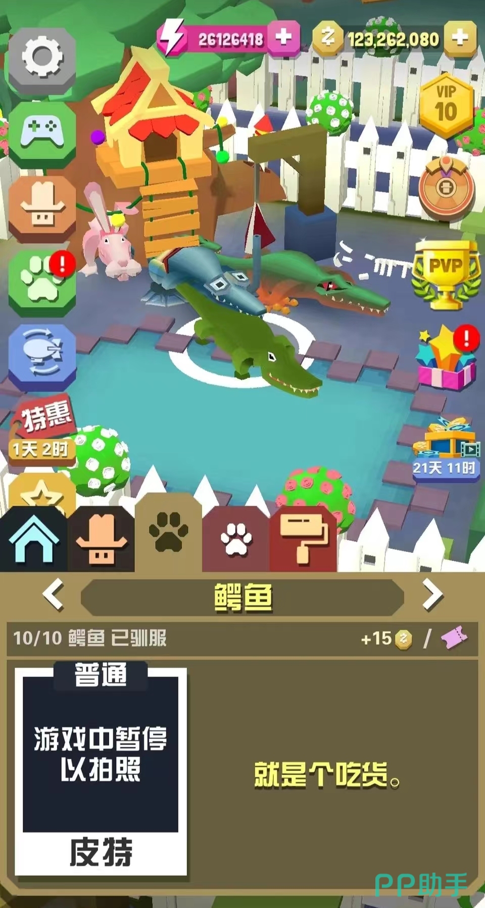 第三个是鳄鱼,鳄鱼的防御能力在游戏里算是最强的了,同时,他的生命值以及攻击力也很高,所以可以用它去组成一个很厉害的防御阵,而且他还有一个鳄鱼之吻的技能,瞬间让自己的实力再提升,会变得更加强大。