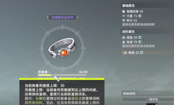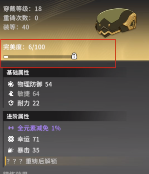 如果玩家所选择的是金色装备,那么还会获得一个特殊的词条。如果玩家觉得有一些不满意,也可以选择重铸,可以额外的获取词条。之后每一次重铸都可以刷新词条,并且还可以增加完美度,一旦在达到上限之后,属性就不会再提升,但是还是可以去额外的刷新词条。这也是玩家在操作时所需要注意的一些内容。