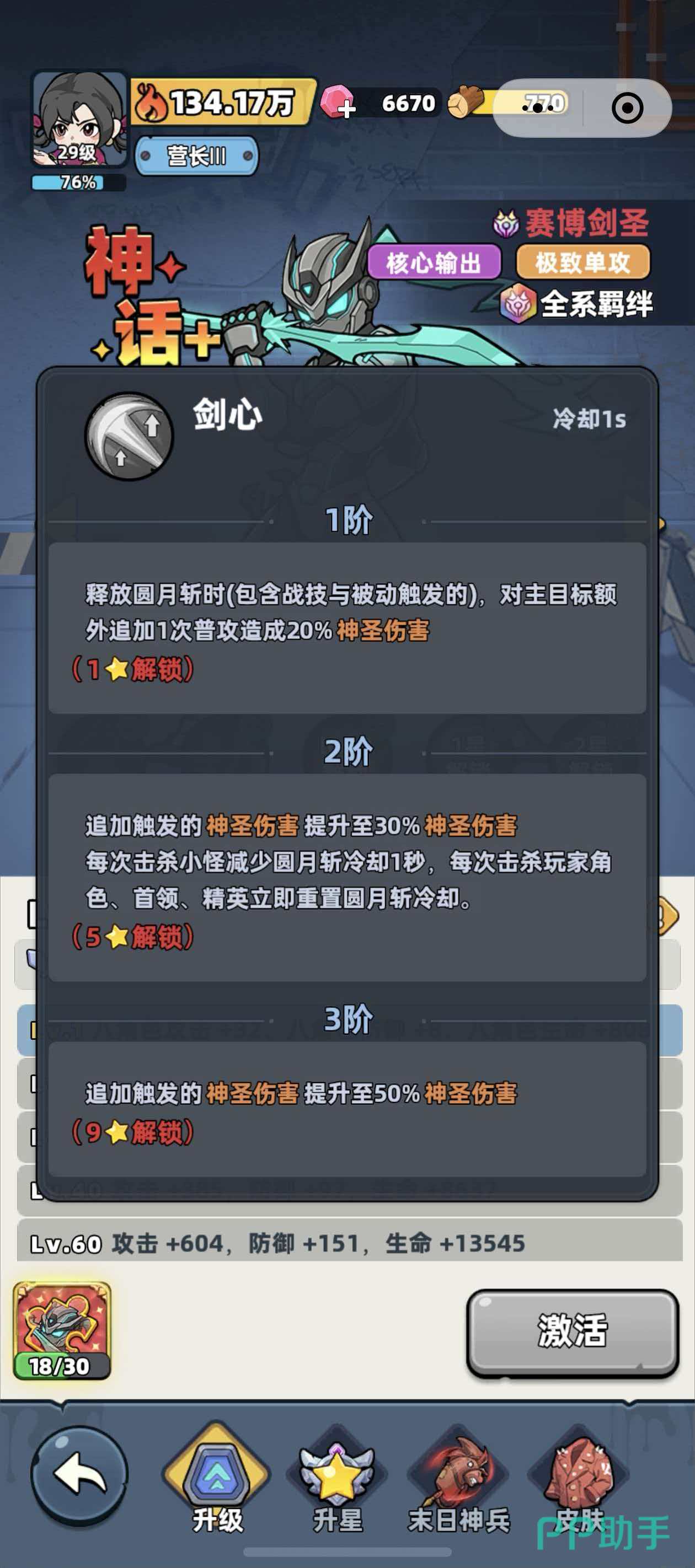 技能设计上强调高频次、高密度输出循环。“圆月斩”为范围物理攻击技,释放瞬间对周围3名敌人造成175%神圣伤害;“剑心”则属于被动协同机制——每当使用圆月斩或其他战技时,自动追加一次普攻,额外造成20%神圣伤害。二者叠加形成稳定且难以被防御机制覆盖的输出链路。