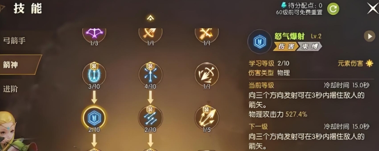 怒气爆射是一个带有伤害束缚效果的强大技能,当箭神施展这个技能时,会向三个方向同时发射出特殊的箭矢,这些箭矢蕴含着强大的力量,一旦命中敌人,在短短3秒内便可以将敌人紧紧捆住,使其无法动弹,其物理攻击力高达527.4%,足以对敌人造成巨大的伤害,而且随着技能等级的提升,下一级的冷却时间为15.0秒,这意味着箭神可以在相对较短的时间内再次使用这个技能,对敌人进行持续的压制。