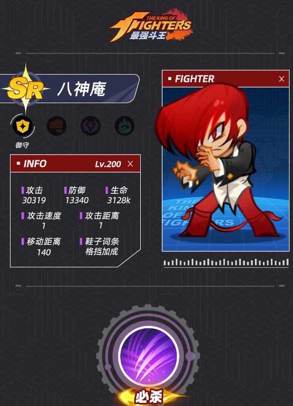 东丈的核心战斗风格围绕泰拳展开,强调近身快攻与多段踢击衔接,具备稳定持续的物理输出能力。在队伍配置中,他可承担前期主力输出职责;随着关卡推进及对手强度提升,其单体爆发与生存能力相对受限,建议中期调整为副C定位,配合高生存或强控场角色形成互补。特别推荐与八神庵协同作战——后者属御守型角色,兼具不俗防御属性与物理输出潜力。当八神庵完成星级强化后,不仅能提升自身破甲与生命值,其技能还可使敌方单位在5秒内治疗效果降低20%,变相增强全队持续作战效率。升至SSR品质后,八神庵可释放紫色雷火技能,对移动目标造成范围高额物理伤害。