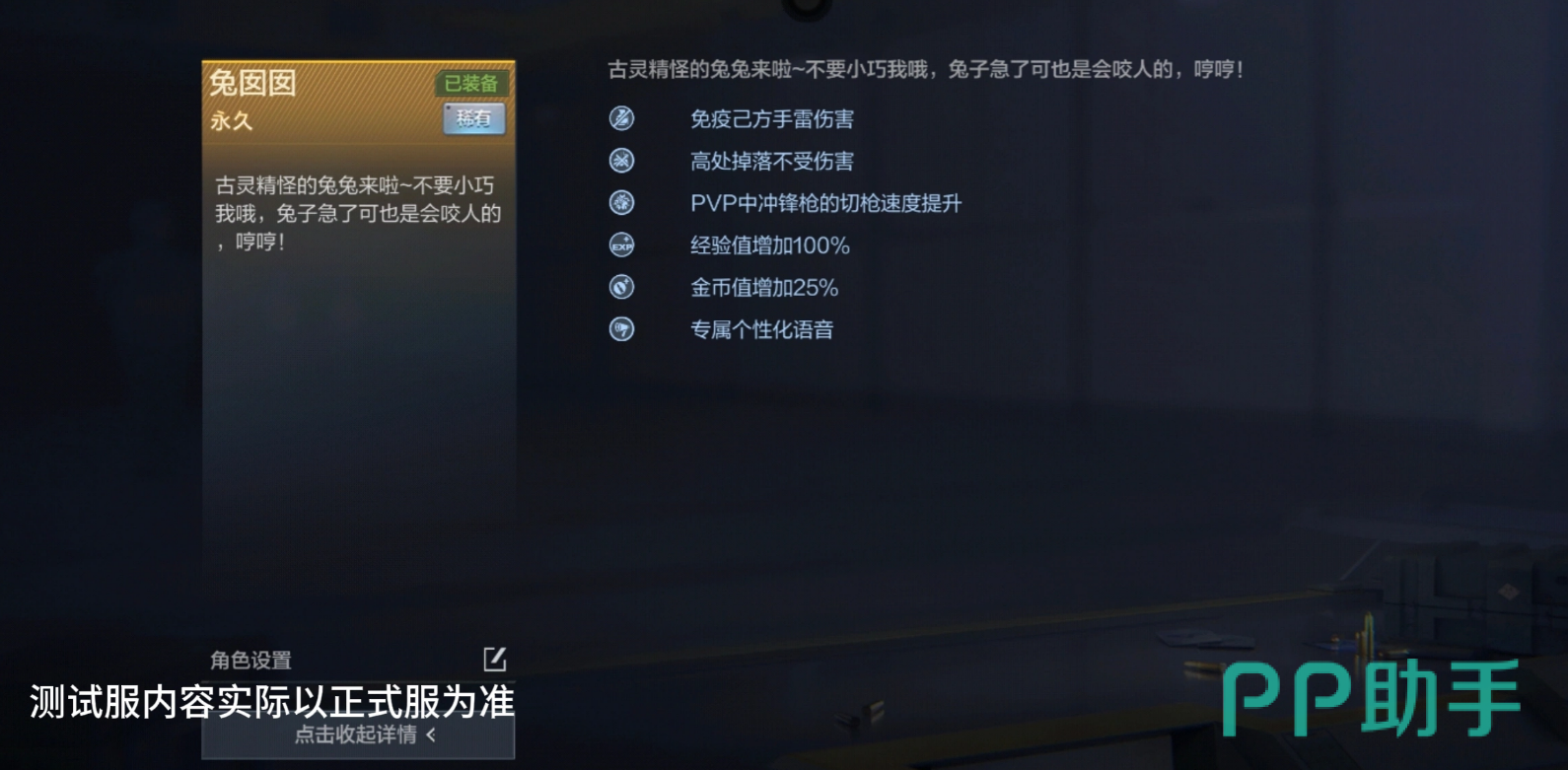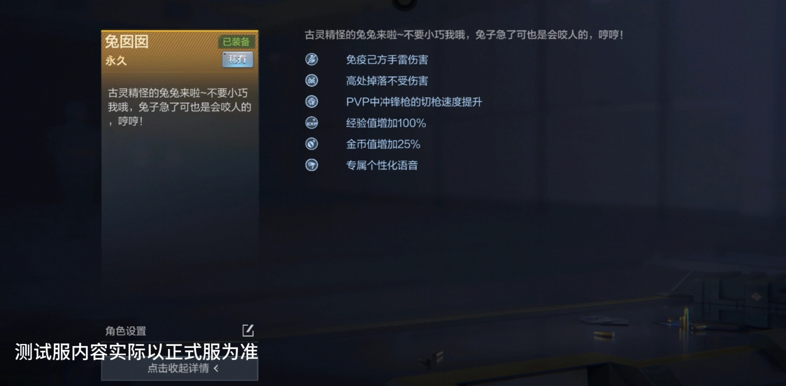 角色觉醒系统为兔囡囡提供进阶成长路径:消耗觉醒石可激活“兔囡囡-X”形态,解锁洗炼功能。洗炼结果随机生成一项额外技能,当前可选范围包括“缩短闪光弹致盲持续时间”与“阵亡时手雷自动掉落并引爆”两类。前者强化对抗控制类道具的能力,后者在爆破模式中形成战术反制点——击杀方若未及时规避,可能触发二次伤害。需注意洗炼结果不可预设,需通过多次尝试获取目标技能。