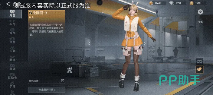 兔囡囡提供双阵营造型:保卫者与潜伏者。保卫者形象以蓝白主色调呈现,身着毛绒短外套与百褶裙,双丸子头搭配白色耳机,整体风格兼具少女感与轻度战术气质;潜伏者版本则采用明黄色连体作战服,外搭白色战术马甲与功能腰封,短发配兔耳式战术耳机,视觉上更突出干练利落的战斗属性。两套外观均保留兔系主题元素,但风格取向明确区分,满足不同审美偏好。