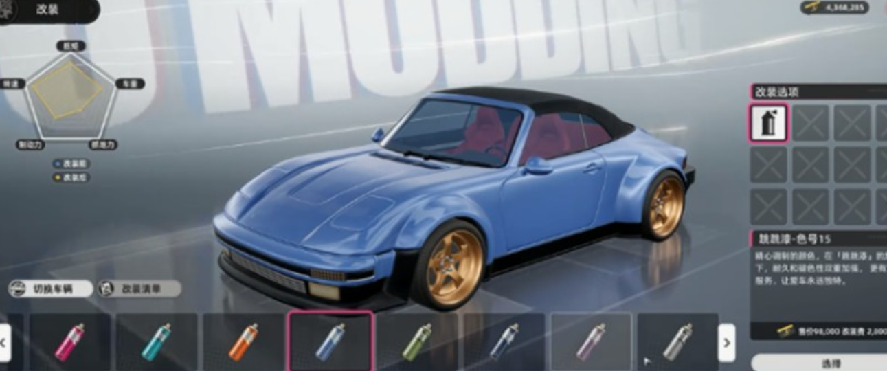 外观定制是多数玩家关注的重点之一。4S店内提供了丰富的车身颜色选项,从低调沉稳的黑色到活力四射的粉色应有尽有,还包括极具科技感的金属渐变涂装。玩家可以根据喜好进行全车喷漆或局部换色,实现更精细的视觉效果。同时,涂鸦系统也为个性化表达提供了空间。你可以在车门、引擎盖等位置添加独特图案,比如卡通形象或个性符号,让座驾真正成为移动的艺术品。