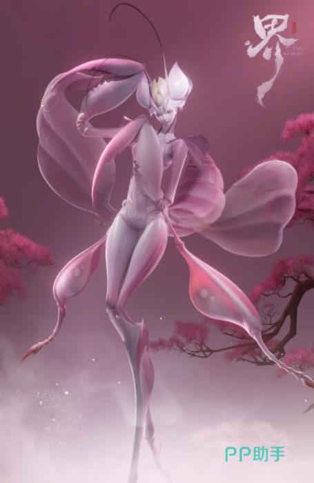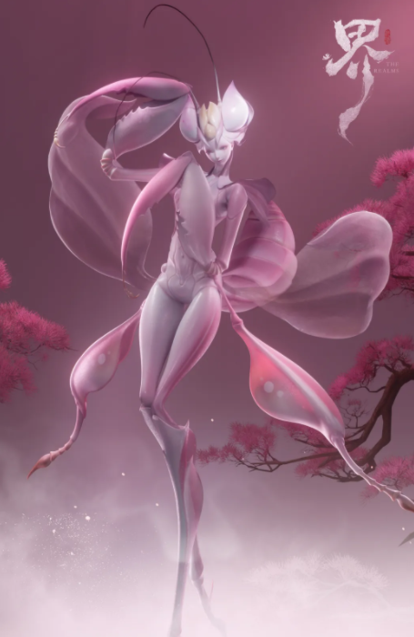 九畹螳娘则颠覆柔美表征:粉雾纱衣、纤细肢节勾勒出看似无害的蝶影姿态,实则以兰香凝露为引,布设致命情网。其镰刃并非装饰,而是生存法则的物理延伸——每一次捕获,皆完成一次生命形态的强制转化。请夜姝同属“诱饵型”精怪谱系,身为飞蛾所化,擅以清越歌喉编织幻听结界,再以绵密情语瓦解目标心防;当对方沉溺于虚妄爱意,躯壳便悄然蜕变为新的飞蛾,成为她永续存在的养分来源。