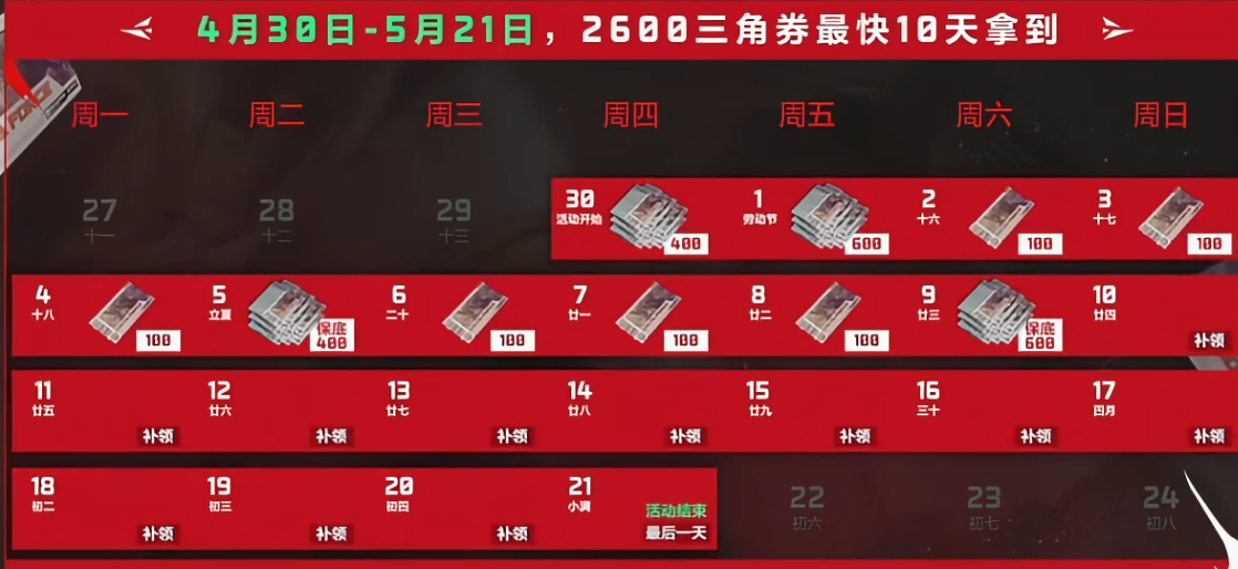 第二项核心福利为登录奖励:自4月30日起,所有参与活动的玩家每日登录即可领取2600点限时三角卷。该资源仅在活动周期内有效,过期自动清零,建议及时规划使用路径。