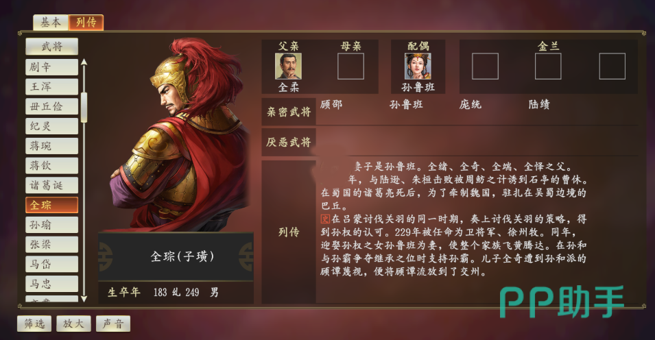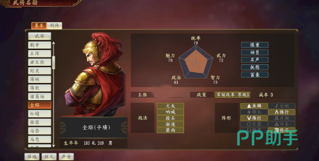 从基础属性来看,全琮展现出典型的全能型中坚将领特质。其武力值为72,统帅达到78,智力也有75,在多个维度上均处于同级别武将中的上游水平。这意味着他既能承担前线作战任务,也能有效指挥部队行动。速度属性为45,初始表现一般,但凭借较高的成长率,在游戏后期经过培养后仍具备可观提升空间。政治与魅力虽不出众,但在执行内政指令或参与辅助玩法时仍可发挥一定作用。更重要的是,全琮的成长曲线平稳,不会出现前期强势而后继乏力的情况,适合长期投入资源进行养成。