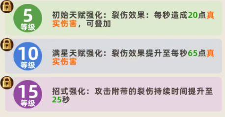等级成长路径清晰强化其核心机制:5级解锁天赋强化,裂伤伤害提升至20点/秒;10级达成满星天赋进阶,单层裂伤伤害达65点/秒;15级则升级主动技能,将裂伤持续时间延长至25秒。这一数值是当前版本极少数具备超长持续时间词条的武将之一,意味着华雄可在整场对局中维持高频真实伤害覆盖,大幅压缩敌方生存窗口。