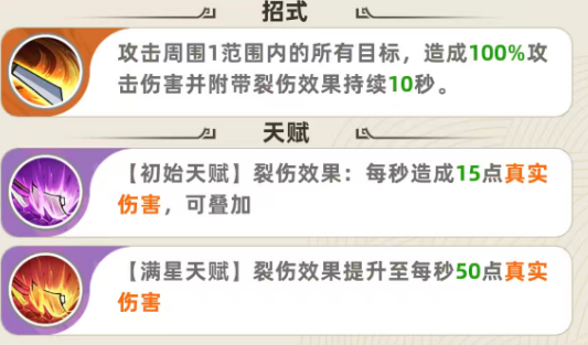天赋系统进一步放大了裂伤的价值。初始天赋即赋予每层裂伤15点/秒的真实伤害,10秒内最多叠加至150点总减益(即削弱敌方150点输出能力)。满星状态下,单层裂伤伤害跃升至50点/秒,配合基础攻击36点、满星增益50点后的86点单次伤害,再叠加多层裂伤的持续触发,使华雄在多回合作战中能实现爆发与续航的双重压制。真实伤害属性无视防御,确保输出效率不随敌方坦度提升而衰减。