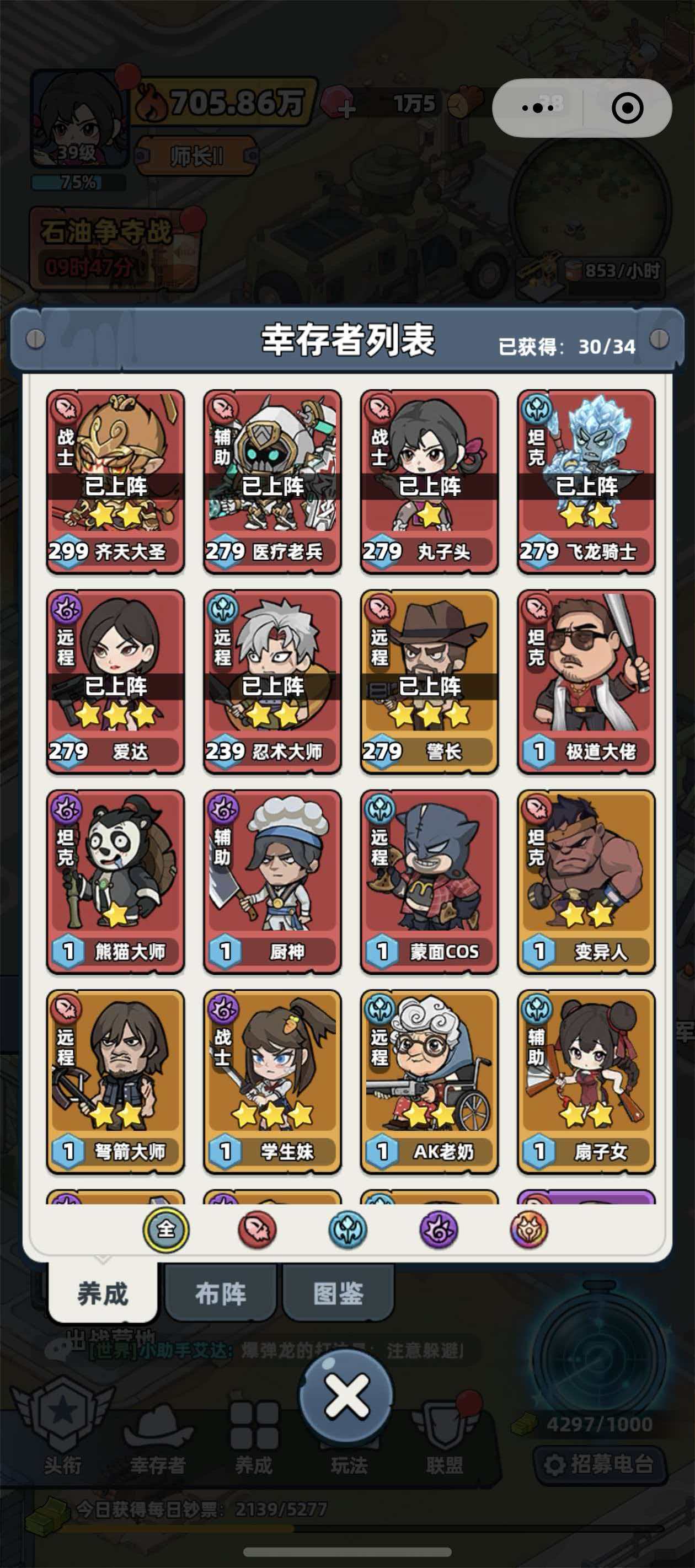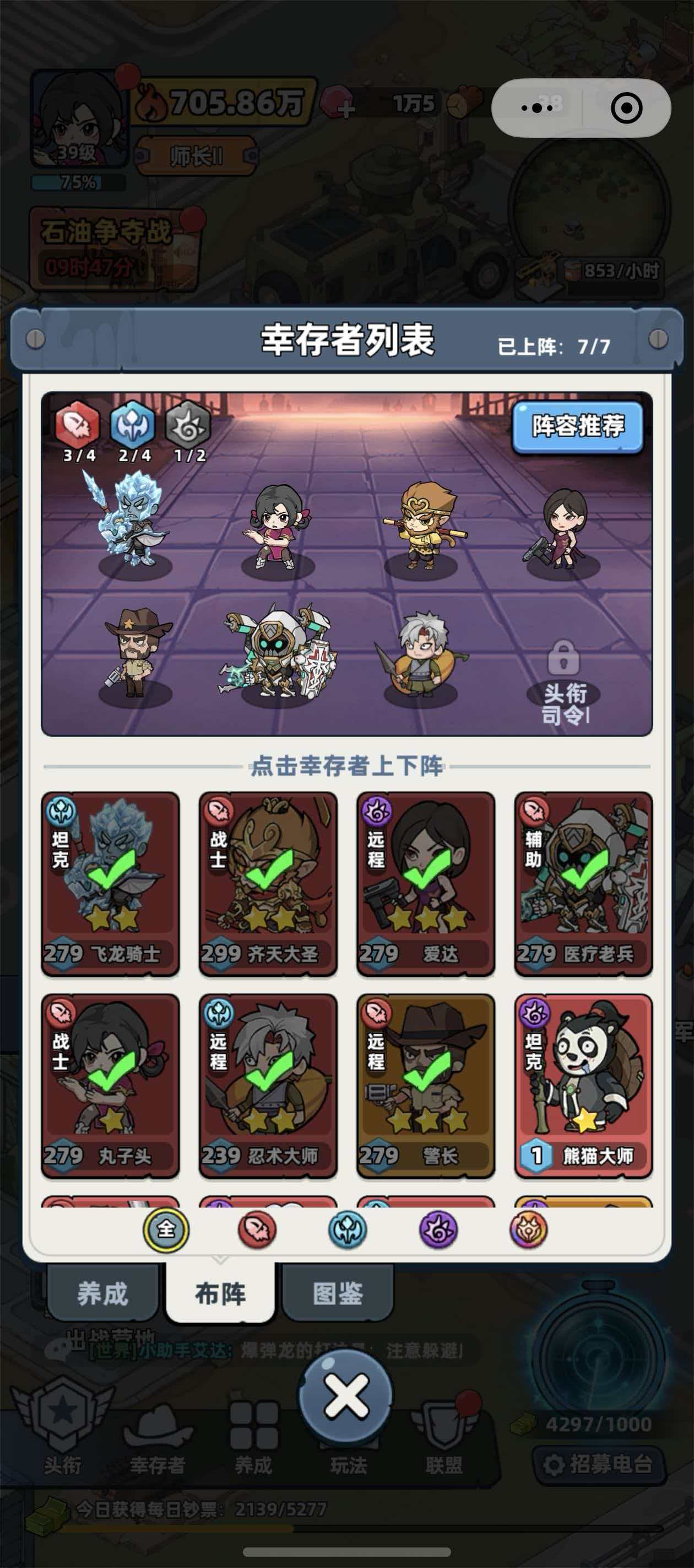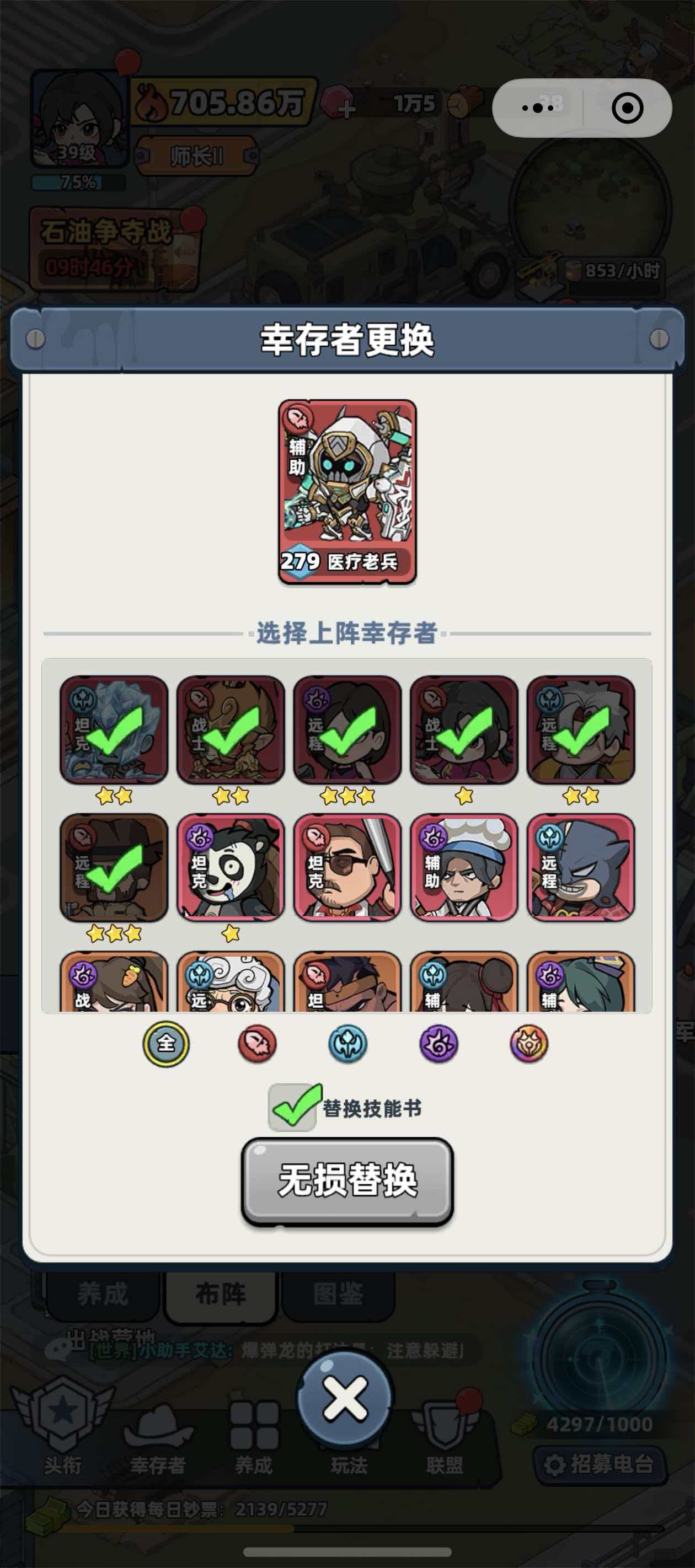 角色更换操作路径清晰明确:进入游戏主界面后,点击屏幕底部导航栏中的“幸存者”入口;在幸存者总览页中,向下滚动至页面底端,选择“布阵”功能模块。此时会显示当前已配置的六人出战阵容。点击任一正在上阵的角色头像(例如医疗老兵),即可唤出角色替换面板。在该面板下方的可选幸存者列表中,选取目标替代角色并点击确认,系统将执行无损替换——原角色所有等级、装备、强化进度均完整保留。特别注意:务必勾选“同步技能书”选项,否则新角色将沿用旧技能配置,可能影响实战表现。