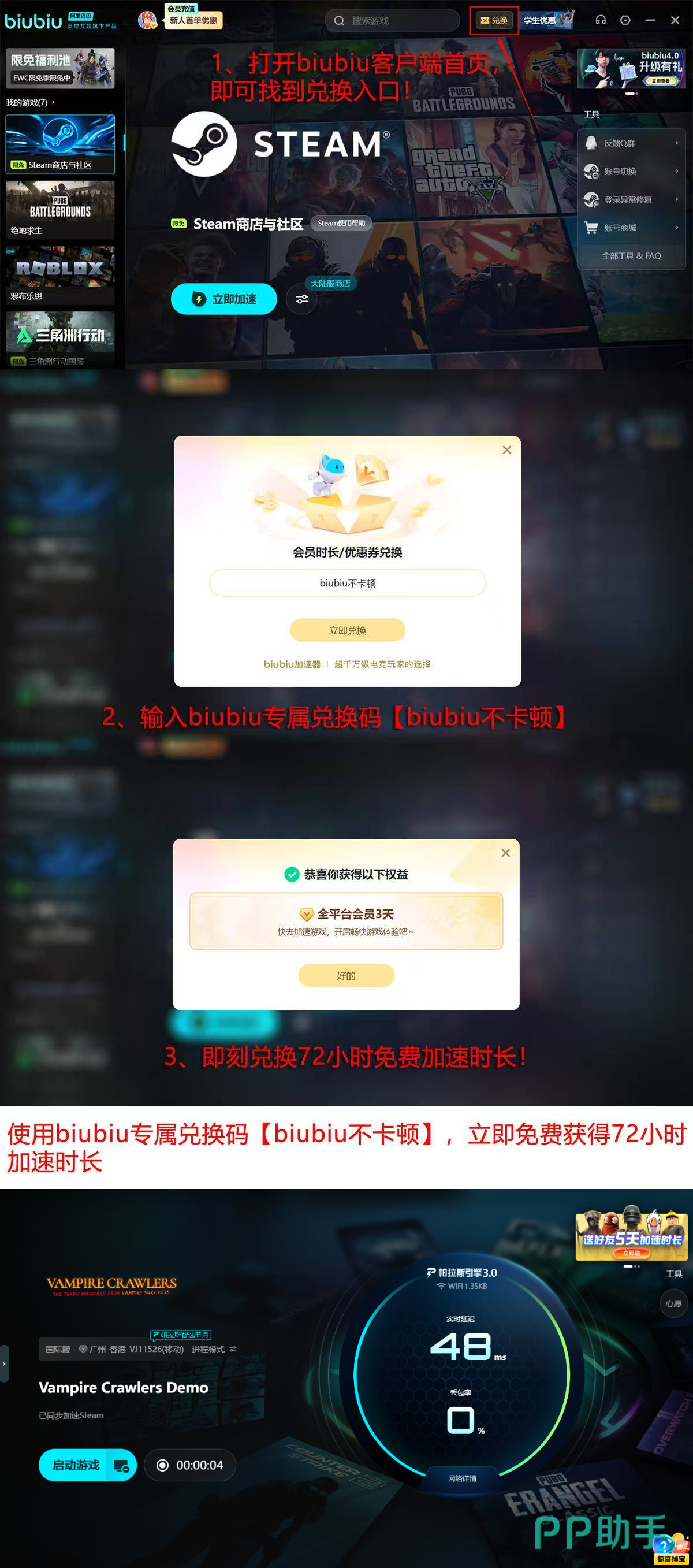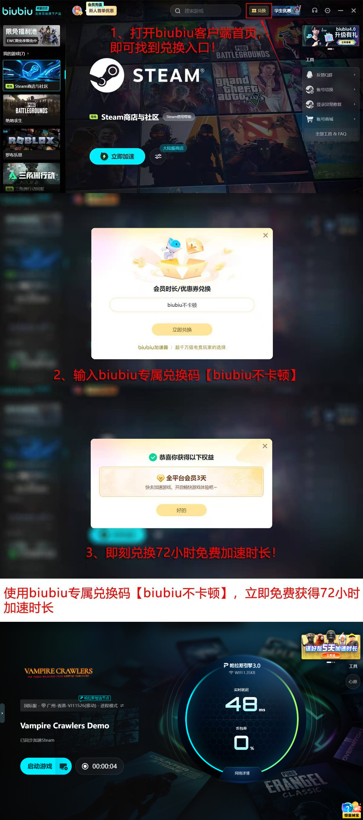 新用户注册即享biubiu专属加速权益:完成注册后自动解锁首日24小时全功能免费试用;输入兑换码【biubiu不卡顿】,额外获得72小时高级权限;合计可享96小时无限制网络加速服务。