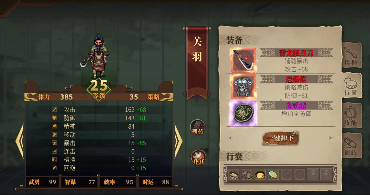 其实游戏中的升迁道具分为转职类与属性强化类两大体系。转职类道具如司马法升迁参军、战国策升迁参谋需结合武将定位定向使用,张飞的重骑兵路线需燕尾牌解锁盾步兵分支,而关羽的勇将路线依赖青龙偃月刀强化暴击属性。属性强化道具如行军鼓提升攻击、避战牌增强格挡应优先分配给主力武将,例如将70%的阵法书投入刘备统率训练,确保其防御值突破70点阈值以抵御中期关卡的高爆发伤害。而耗材方面我们通关就能随机获取,不够只有多刷。