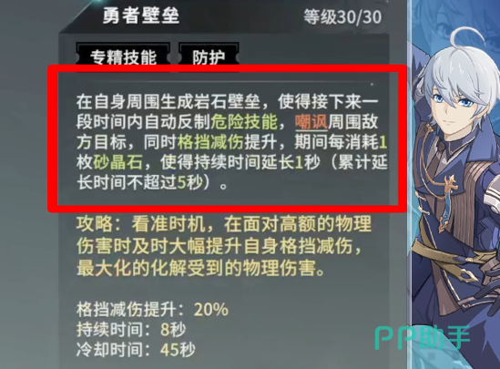 砂石斗篷这个技能使用的时候角色会汇聚砂石,对周围敌人造成伤害,随后每秒对周围敌人造成持续6秒的伤害,期间回复怒气和沙晶石,有了一定群伤能力,岩怒之击这个技能则是会消耗砂晶石,对目标造成伤害,并降低敌人在接下来的10秒内造成的伤害,输出伤害较高,晶石足够时可以直接释放打伤害。勇者壁垒这个技能使用的时候会在自身周围形成岩石壁垒,接下来的8秒内自动反制危险技能井嘲讽周围目标,提升自身格挡,是一个很强的生存技能。
