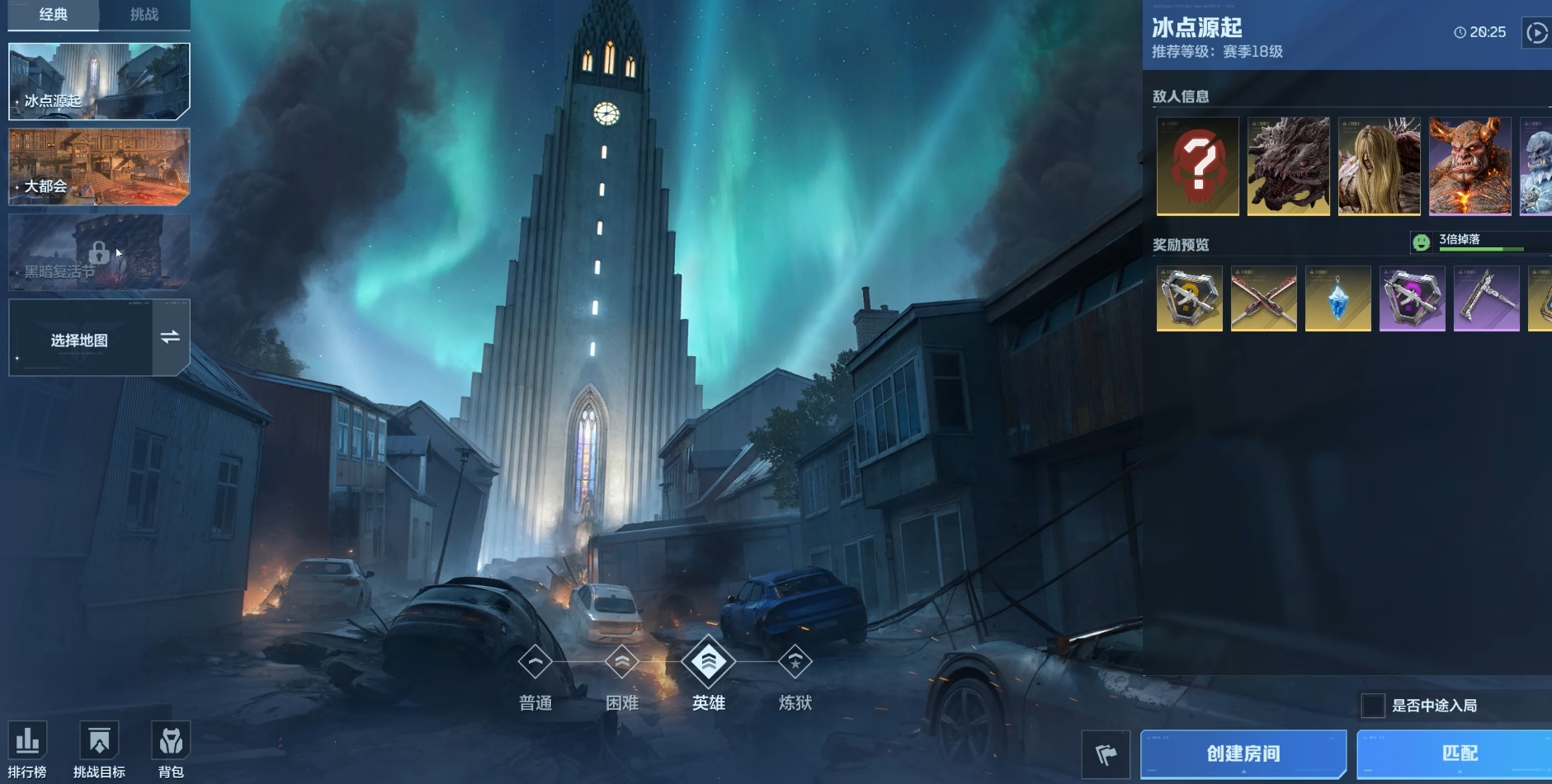 在游戏主界面点击【选择战场】,即可定位到“经典猎场”与“猎场竞速”两个常驻模式入口。其中,经典猎场包含三张固定地图:冰点源起、大都会、黑暗复活节。每张地图均配有详细敌情预览与通关奖励说明,便于玩家提前规划配置。该模式支持单人挑战、好友组队或公开匹配组队三种参与方式;难度档位可自由选择,但无论采用何种组队形式,任务节点、路线逻辑与Boss机制均完全一致。基于实战反馈,多人协作可显著提升清怪效率与容错率,建议优先组队推进。