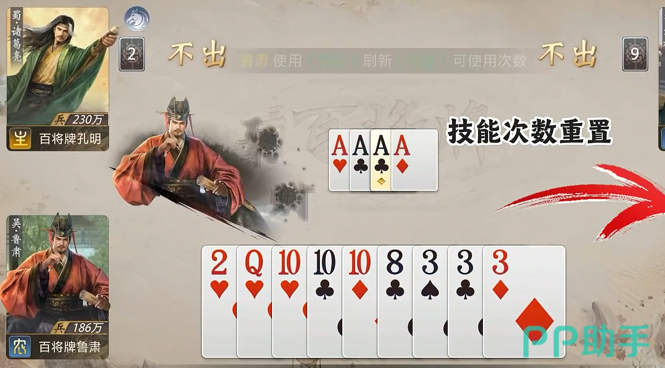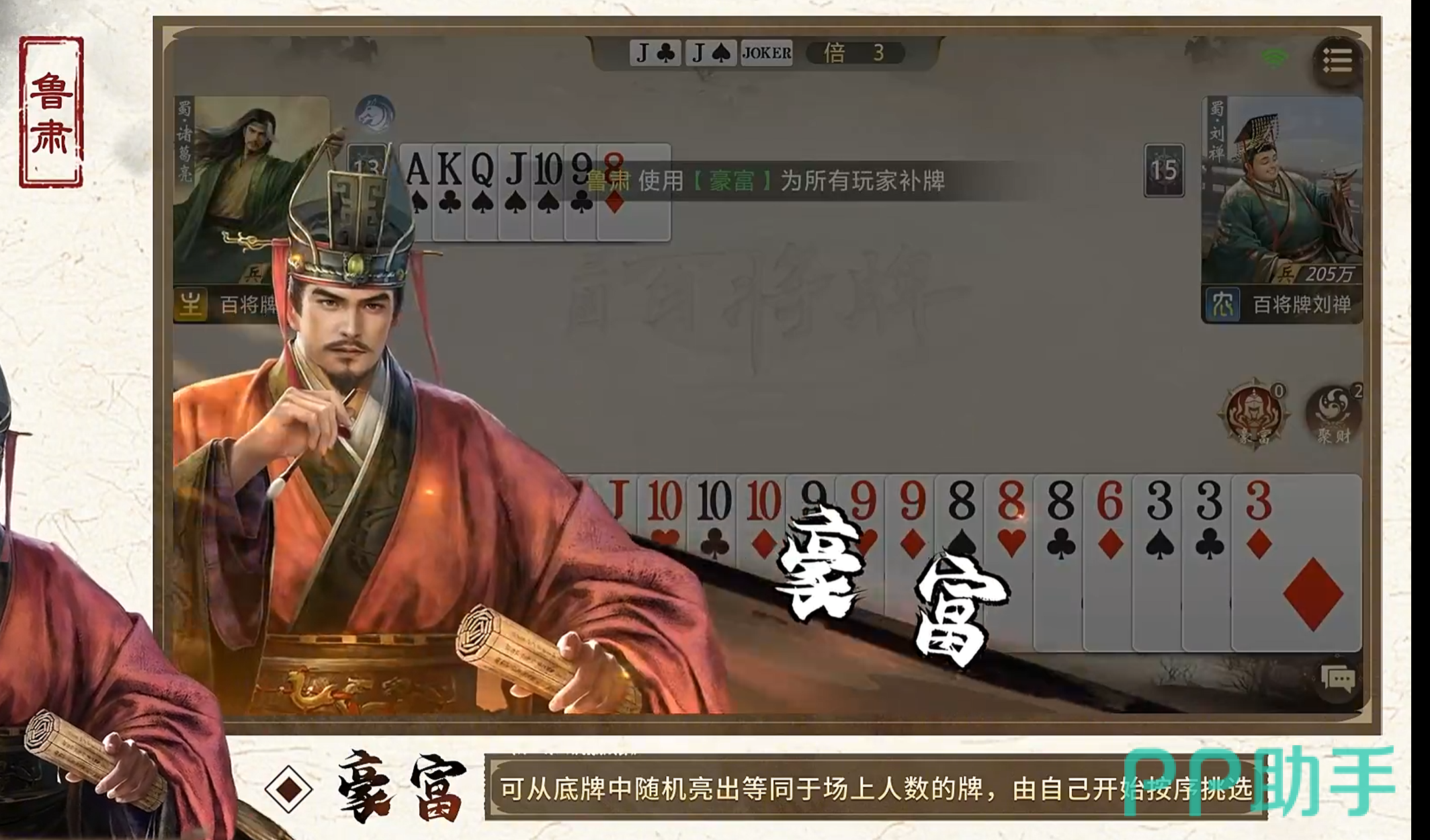 鲁肃的核心技能【豪富】具有明确的数值逻辑:亮牌数量恒等于当前对局人数(如三人局亮三张、五人局亮五张),且选牌顺序固定为鲁肃优先。该机制赋予其双重战略价值——一方面可主动获取高点数单牌、未出现过的稀有底牌,强化自身出牌连续性;另一方面,通过控制分配次序,能有效规避敌方凑成炸弹、顺子等强力组合,实现被动压制。尤其在前期手牌匮乏阶段,【豪富】可稳定维持手牌厚度,为中后期战术展开预留操作空间。