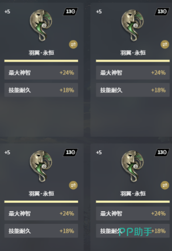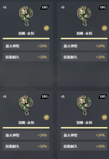 剩余插槽推荐统一装配羽翼永恒,此魔之楔可增加24%最大神智与18%技能耐久。神智资源的扩充有助于保障技能循环不断档,而额外的技能耐久则进一步巩固了持续作战能力。这一配置属于通用性强且稳定性高的方案,适用于大多数战斗场景。