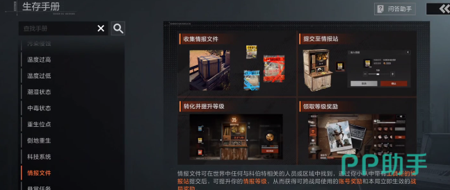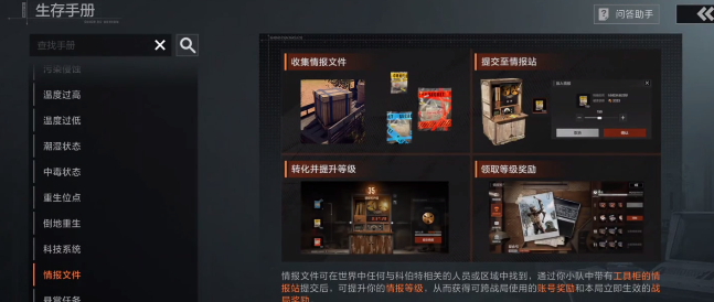 玩家需要先了解情报是什么,在什么地方获取。游戏中的生存手册是一个主要的帮手,在打开之后就可以获得情报,这就是一个关键的道具。玩家还需要合理的利用地图,在打开地图之后点击地图上的图标,就会发现仓库物资的数量是不一样的。每一个地方的危险程度不同,物资的爆率也会有高有低。