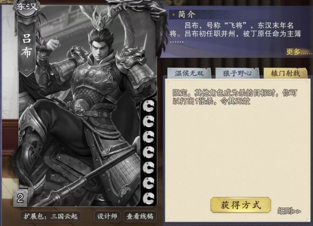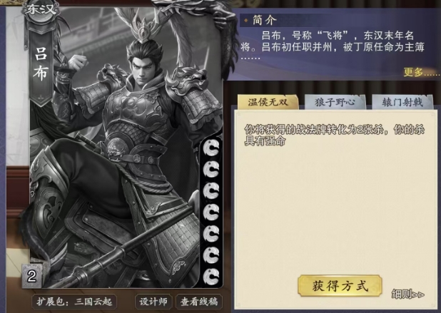 这一转化过程极为彻底,它不仅仅是简单地将战法牌替换为杀牌,而是从根本上改变了目标卡牌的本质,使其在本局游戏的剩余时间内完全转变为全新的杀牌,这种转化效果持久而深远,直到游戏结束都不会消失,值得注意的是这种转化是先销毁原有的战法牌,然后再以新的身份,也就是两张杀牌的形式重新出现在吕布的手牌之中。