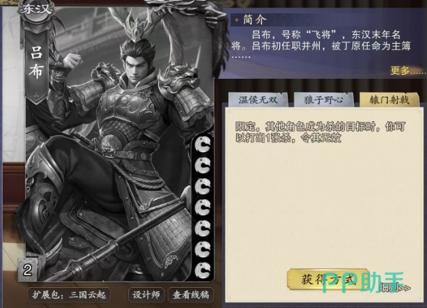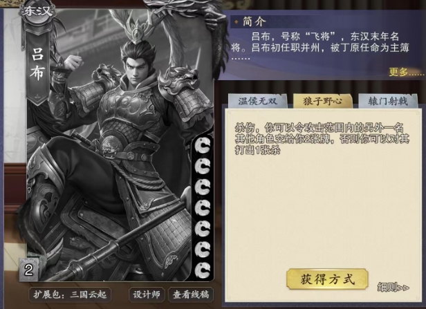 另外还有狼子野心这个技能也是他的核心能力之一,当持有该技能的角色发动它时,能够针对攻击范围内的另一名其他角色产生独特的效果,此时这个角色有两种方式可供选择,一种是主动交出2张牌给技能持有者,另一种则是,如果对方拒绝交出牌或者无法交出足够的牌,那么技能持有者便可以对其打出1张杀牌。