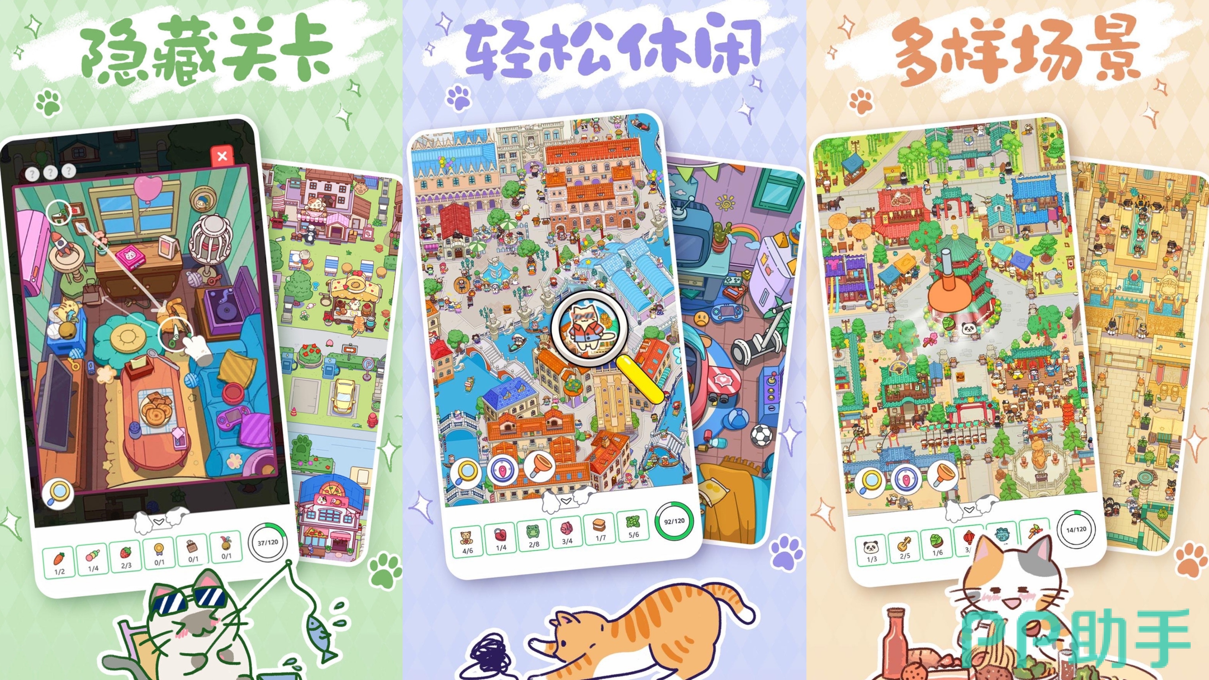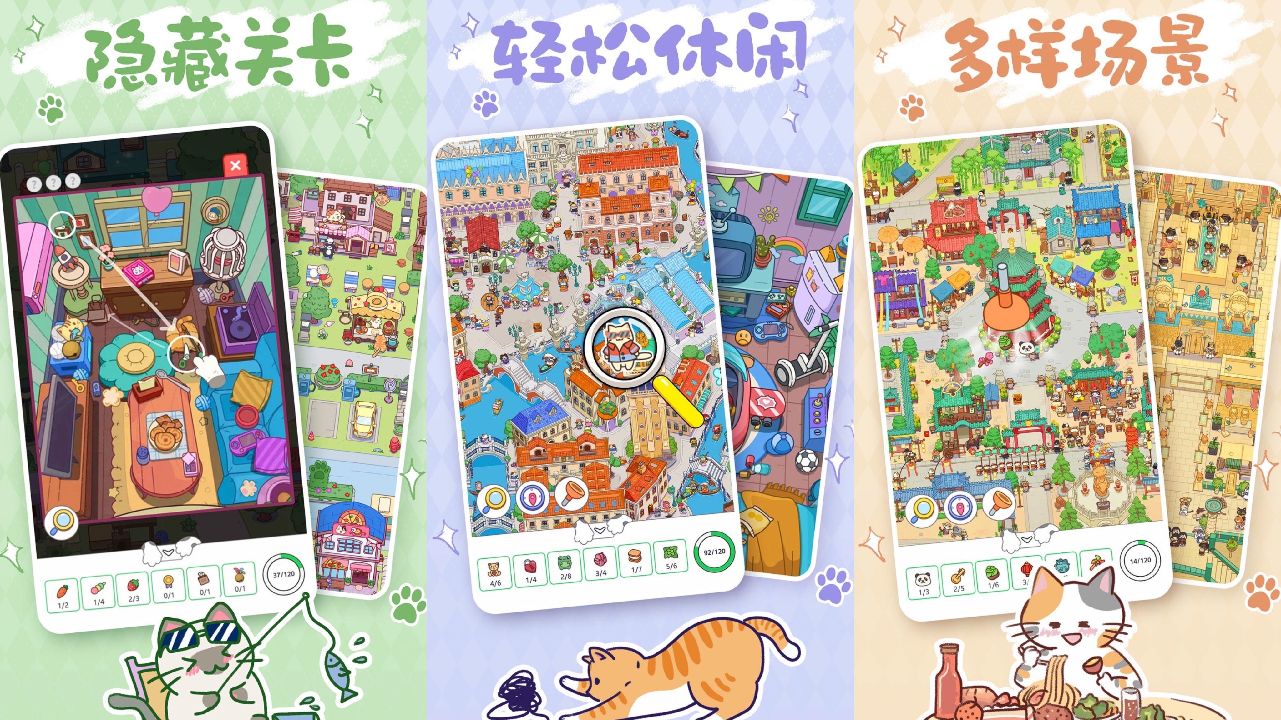 这是一个充满了猫猫的世界,这里面充满了猫猫们的小宝藏,它们散布在不同的房间中,每一个房间都是一个关卡,我们需要利用猫猫神给我们的道具去寻找这些散落的宝藏。游戏画风特别可爱,每一只猫猫都有自己的特色,每个场景都设计得十分精美,而且玩法内容也是丰富多彩,关卡难度适中,是一款非常适合休闲旅游的游戏!如果你喜欢猫猫且眼力非常不错的话,那么这款游戏一定不要错过哦!