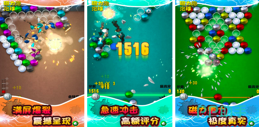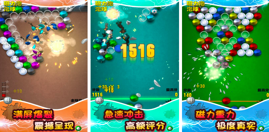 一款金属感满满的泡泡龙游戏——磁力泡泡球,将金属感融入到了泡泡龙游戏当中,玩家可以看到金属光泽的泡泡,并且通过经典的玩法来不断闯关,在此基础上,他还增加了更逼真的磁力、惯性等物理元素内容。炸弹、闪电等多种真实辅助道具,让玩家感受更多的消除快感。满屏炸裂的特效,不断冲击着玩家们的眼球,多种消除效果随机解锁。