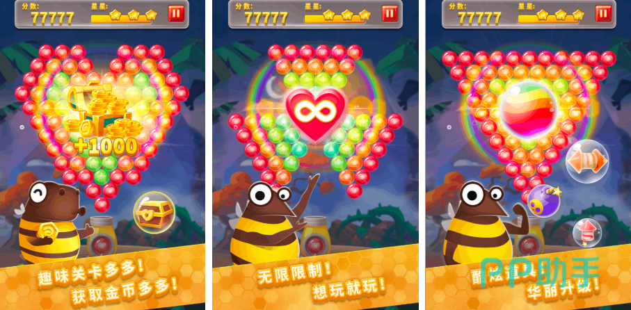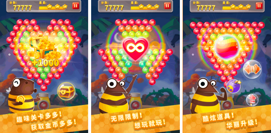 泡泡龙物语,将带你开启不一样的消除之旅,作为一款画风清新的泡泡龙游戏,玩家将在这里,与小蜜蜂体验数百个消除关卡,而且还能够帮助小蜜蜂,成功收集到泡泡里的蜂蜜。道具更加丰富多样,在体力上也是无限制的,玩家随时随地上线都可以体验,定期的主题赛季,让你拿礼物拿到手软。
