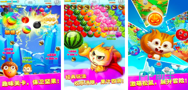 水果泡泡龙,不仅打造了水果主题的泡泡画风,而且在游戏中,还贯穿了有趣的故事情节,松鼠小特工寻找到了一张藏宝图,而踏上了一场征服坚果的消除泡泡旅途,游戏画风更加q萌可爱,在炫酷的消除视觉感受上,还加入了超劲爆的特效音,为玩家提供视听双重享受,数十种不同道具,让玩家开启最丝滑流畅的消除体验,经典的消除玩法,百个趣味关卡。