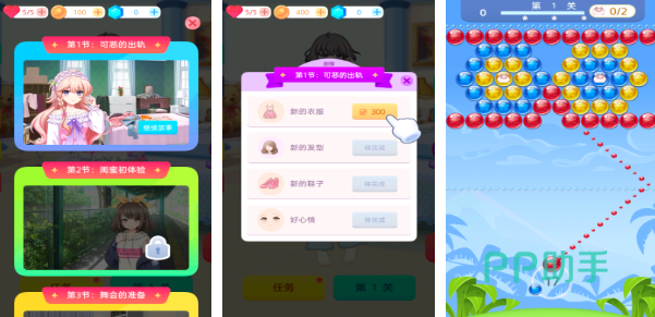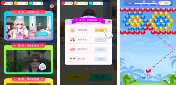 泡泡龙2022,一款将换装、剧情、泡泡龙消除玩法相结合的小游戏。在这里,不仅有上百个泡泡龙消除关卡,而且游戏中,还有几十套服装、几十个好看的二次元角色,等待你收集,在这里,你可以通过关卡获得金币,并按照自己的审美,装扮每一个二次元角色和她们房间,DIY元素的加入,让这款游戏的耐玩度增加。