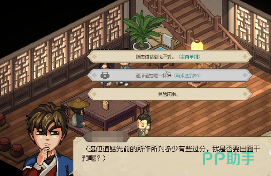 客栈中还会触发道姑绛紫烟的任务,击败道姑遇到杀手追杀,选择救援道姑后刷满道姑的好感度从而获取大量毒门经验,同时可以邀请入队学会会遇到一群久离部落的人追杀道姑。再把这些人打赢之后,把道姑的好感刷到100,可以获得600点的下毒经验。然后邀请入队学会断情掌。客栈中前期可以与混混交手,击败后可以前往混混街,入场费三两碎银交上见到江南怪,触发剧情获得参加拍卖会的机会,能够在拍卖会上选择购买各类珍奇异宝,但需要注意金钱是否充足。