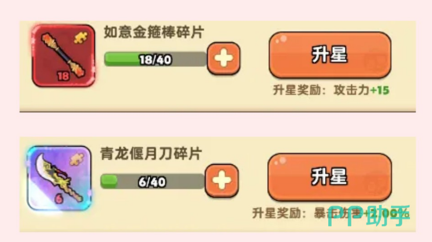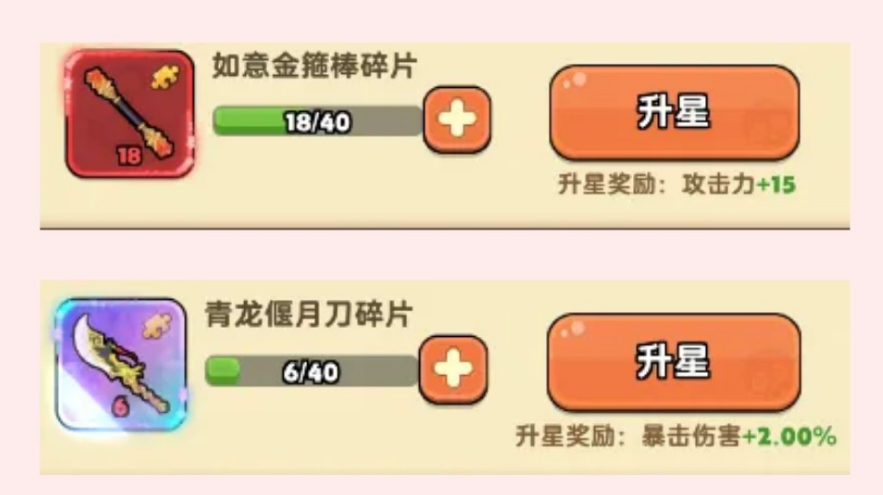 升星的价值远不止基础属性增幅。关键星级会触发质变效果——以火系神器“金箍棒”为例:3星解锁首层技能强化,清怪节奏略有优化;6星为首个核心节点,激活专属技能牌“力大无穷”,使金箍棒技能可额外释放一次(伤害降低20%),形成稳定双段输出,实战覆盖率与DPS提升显著;9星开启羁绊系统,支持神器与武器、角色属性间联动,达成特定组合即可激活额外增益,在PVE挑战Boss及PVP对抗中均体现明显压制力;11星再次强化技能效果,但此时单位碎片投入产出比开始回落。