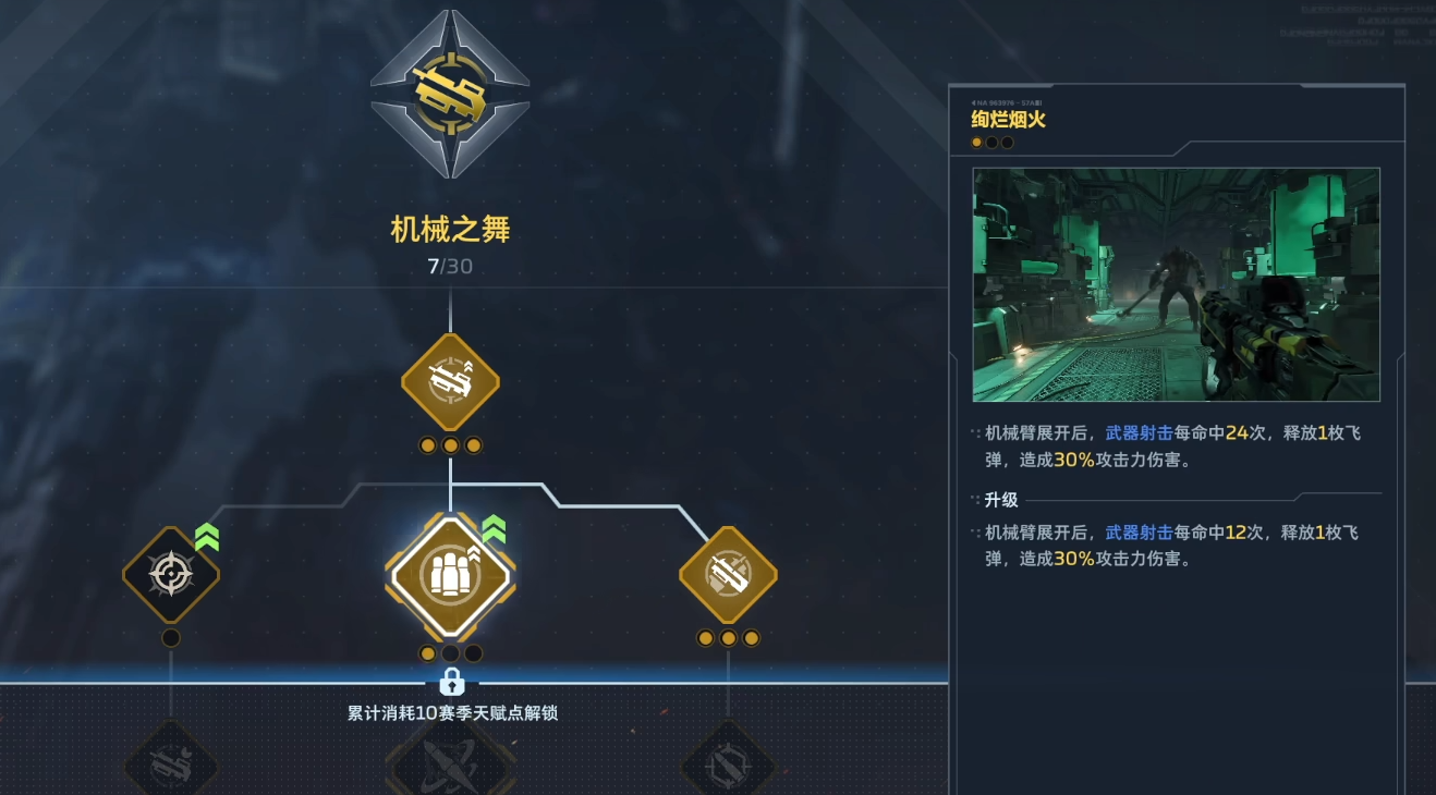 面对高血量Boss或竞技对抗场景,则应侧重「机械之舞」方向的深度培养。该分支解锁多项单体特化天赋,如「绚烂烟火」——累计命中24次后自动释放飞弹,造成额外真实伤害;「死神时刻」——武器每完成8次攻击即发射一枚追踪导弹,稳定叠加持续压制效果。此类天赋不依赖瞬时爆发,而强调攻击动作与伤害反馈之间的精准耦合,特别适配突击步枪、冲锋枪等高射速单点输出型主武器。