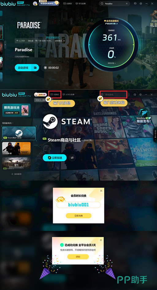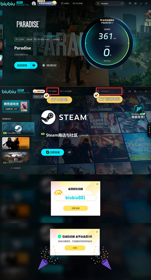 除了这些方法之外,玩家也可以选用一个网络加速器,网络的卡顿可能会导致游戏闪退或者是卡顿延迟,这里推荐一款biubiu加速器,点击以上的链接,新用户在完成下载之后可以免费3小时。此外还可以申请延长免费加速时长,在加速器的页面复制口令【biubiu001】能延长72小时,两者可以叠加使用,一共是免费75小时。