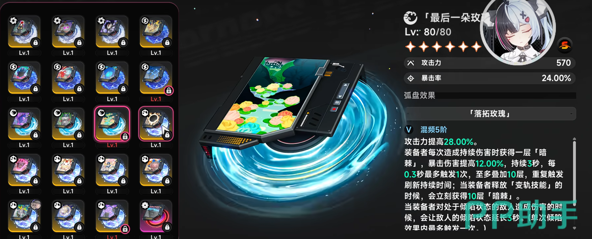除暗棘加成外,“最后一朵玫瑰”还具备第二重关键机制:触发“倾泄”效果时,可延长该效果持续时间3秒。双被动协同运作,使其与角色“安魂曲”形成高度绑定关系。安魂曲不仅为纯暗属性角色,其技能设计亦支持高频、多段触发“倾泄”,从而持续激活弧盘的暴击伤害增幅,实现输出循环的极致压缩与伤害密度最大化。从机制耦合度来看,该弧盘实为安魂曲量身定制的核心输出组件,以安魂曲为轴心构建队伍时,其抽取优先级与资源投入回报率均处于当前版本第一梯队。