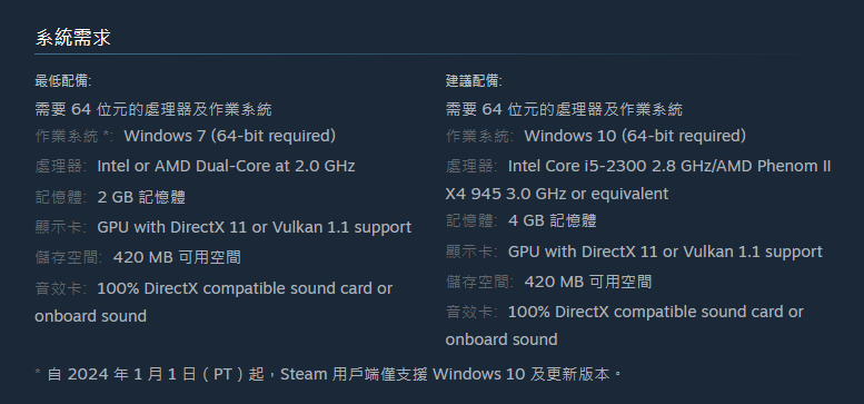 这是一个超级老的游戏了,最初的版本是1999推出的,现在重制也是在这个基础上制作的,所以整个硬件要求就不是很高。只要有处理器就行了,显卡核显也能用,存储空间甚至只要420mb。