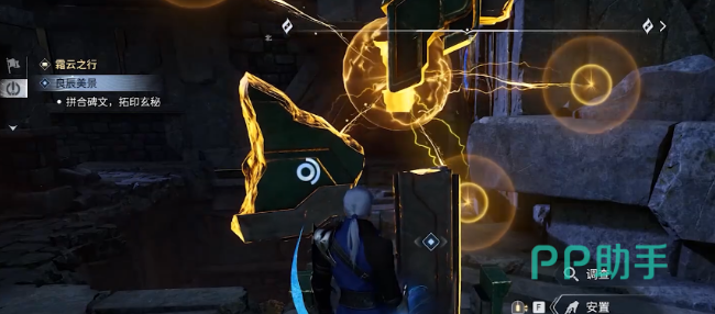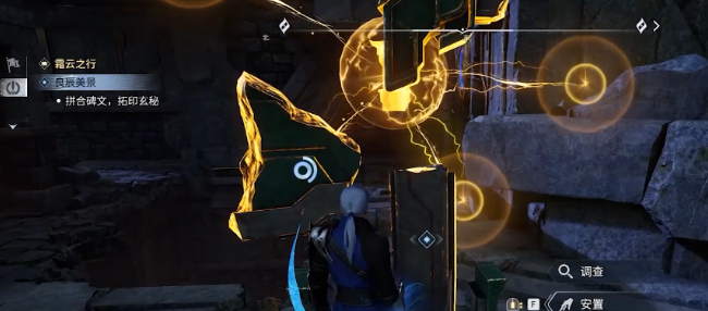 任务第二阶段要求修复石碑。玩家需在石碑周边范围内搜寻四块散落石构件:第一块藏于正对石碑的悬崖下方洞穴内;第二块置于邻近碎石堆边缘;第三块掩于右侧石堆缝隙中;第四块位于左侧岩壁高处平台。每块石构件旁均设有蓝色牵引装置,必须先拾取该装置并装配至石块上,方可完成搬运与精准拼合。全部归位并完成结构复原后,剧情自动推进。