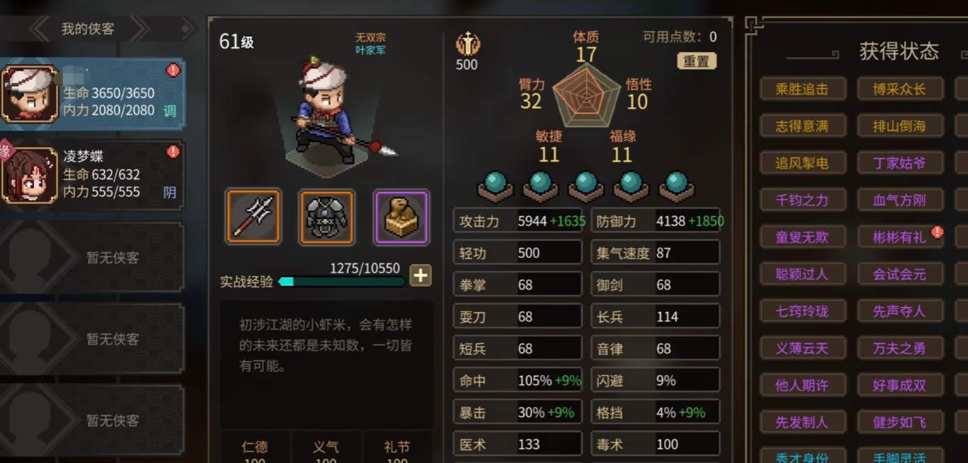 大侠立志传是一款古风古色的开放大世界冒险手游,在游戏中玩家要扮演一名侠客,通过不断的结识各路的NPC,学习江湖之中各类名流武术,游戏的最开始,玩家需要选择自己的基础属性,基础属性总共能随机选择十次,玩家天生携带的词条将决定玩家日后所选的发展路径,游戏中如果玩家想要壮大自己的队列,则需要和各个NPC处好关系,通过日常打招呼或者赠送礼物来达成对应NPC的好感度,最终邀请这些NPC进入自己的队列。