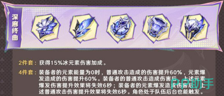 如果你的阵容中有冰系角色,特别是喜欢常驻队伍的冰系角色,那么深廊终曲这套圣遗物绝对是你的新武器。它的效果,不管是普通攻击的增幅,还是元素爆发的提升,都能让你的冰系角色在战斗中如鱼得水。两件套效果能够提供15%的冰元素伤害加成,这对任何冰系角色来说都是一个非常直观的提升。冰元素伤害的提升意味着你不仅能让敌人更快地被冻结,还能增加更多的伤害输出。