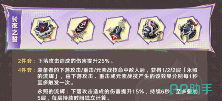 而四件套效果则更加给力,装备者在下落攻击、重击或元素战技命中敌人后,都能够触发“永照的流辉”效果,提升下落攻击的伤害。最精彩的地方是,“永照的流辉”最多可以叠加5层,每层持续6秒,并且每层的持续时间是独立计算的!这意味着你可以通过不断的攻击来维持伤害加成,简直是为那些喜欢快速消耗敌人的玩家量身定制的。通过这种方式,玩家可以将伤害效果最大化,输出爆发力大大提升。