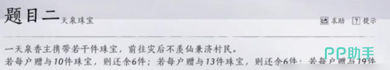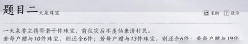 玩家们可以利用概率推算的方式,最后的到五到六天才可以评鉴这三种茶水的结论,完成这个任务之后,就是天泉珠宝,在这个任务中,会给出一个条件,玩家们需要通过解方程的方式,来最后推算出一共携带了22件珠宝,除此之外,还有第二个问题,携带珠宝救济村民,同样利用同余方程,来进行解答,最后携带了136件珠宝,还有三更天业障的问题,由于七位道修违反了门规,因此,解脱众生,解脱了93人,人数互补对等。