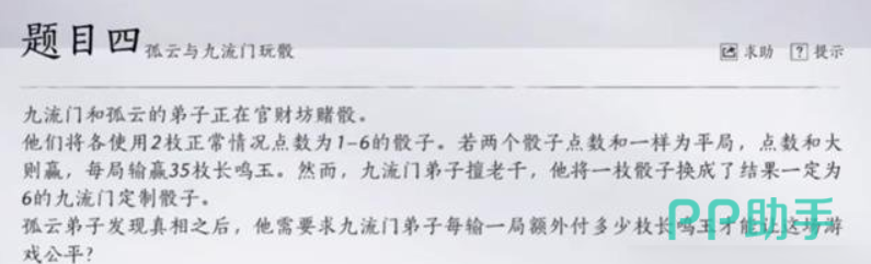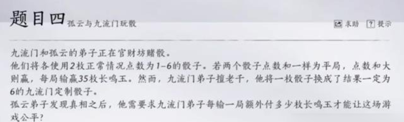 玩家们需要通过计算,来算出业障最多的道修,最少解脱17人,而在第二个问题中,一共解脱了97人,玩家们需要通过推算来找到业障最多的解脱了34人,最后一个就是孤云与九留门的玩骰,由于玩骰子作弊,大家需要计算出每一个弟子,每一局输了,需要支付多少的货币。