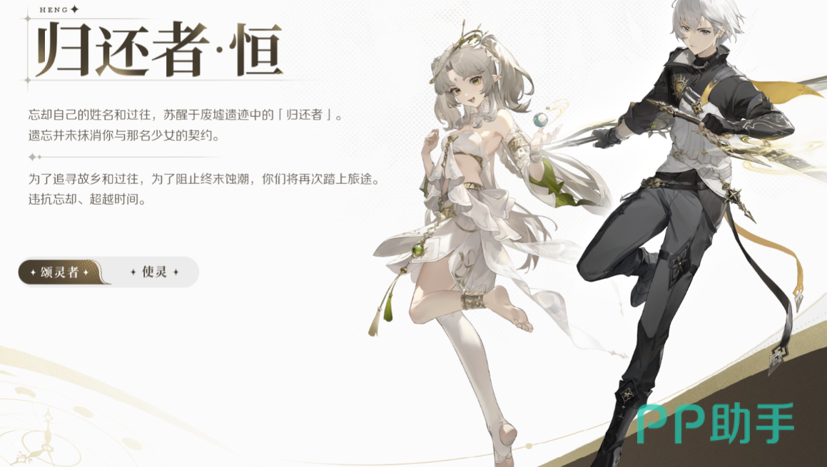恒是本作默认命名的男性主角,银发短打、双剑在手,动作迅捷干练。他以“归环者”为身份标签,在游戏开篇即苏醒于一片焦土废墟之中,丧失全部过往记忆。此时,一名同样失忆的少女出现在他身旁——她并非普通同伴,而是与恒缔结契约的使灵。二人在确认彼此绑定关系后,决定携手踏上寻回真相的旅程。这一设定不仅奠定了主线的情感基调,也构成了整个循环叙事的逻辑起点。