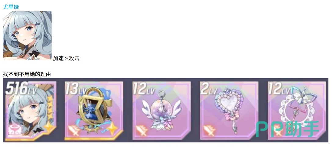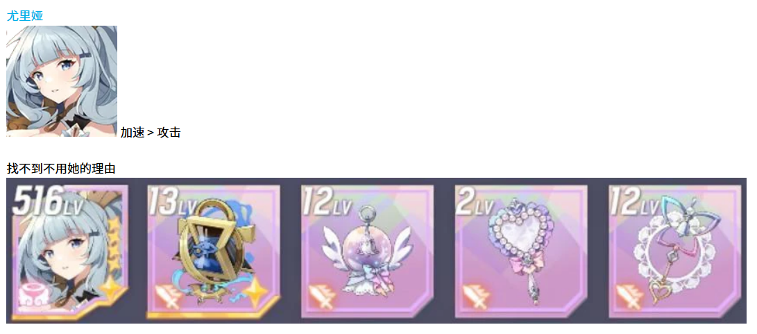 尤里娅是天使体系中不可替代的节奏引擎。其全部主动技能均依赖高频率释放来实现持续群体增益与状态覆盖,因此速度(加速)为绝对首要属性,直接决定每回合行动次数与辅助覆盖率。攻击力仅作为次要补充,用于提升部分技能的基础伤害段或附加效果强度。推荐选用固定主属性为速度的套装,副属性优先锁定速度加成,其次可考虑效果命中或能量获取类词条,确保其在多段战斗中始终处于先手链顶端,稳定带动全队行动节奏。