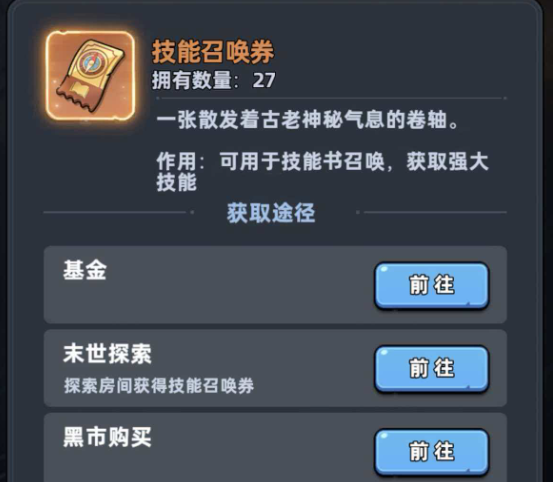 获取技能书主要有两大稳定渠道:其一是通过“技能召唤券”进行概率抽取,该道具可通过世界地图探索获得——所有标有“开启门”图标的房间进入后均可领取;其二是开通“技能书基金”,该机制可在每次角色进阶时自动发放固定技能书,属于零成本长期收益。此外,黑市虽支持直接购买,但单张售价达150钻石,建议留待中后期钻石储备充足后再酌情使用。值得注意的是,在高难度场景探索节点中,存在直接掉落完整技能书(含限定款)的概率,这为欧气玩家提供了加速成型的捷径。