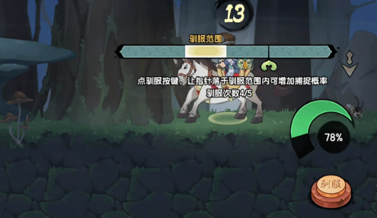 驯服过程并非纯随机事件。进入森林场景后,锁定目标宠物将触发驯服界面,其中动态移动的光标区域即为判定窗口。系统默认提供5次手动干预机会:当光标滑入高成功率区间(视觉上为中央亮色带)时,及时点击即可单次提升2%驯服概率。若5次全部精准命中,累计可获得10%基础概率加成——这一操作机制强调节奏感与反应精度,是新手快速上手的关键突破口。