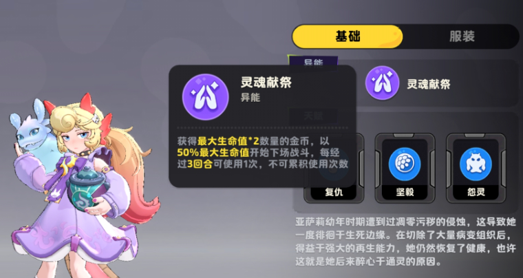 她的经济系统同样具备策略深度。“灵魂献祭”天赋允许她在释放异能时,按自身最大生命值的2%获得金币,并在下一场战斗开始时,以相当于50%最大生命值的护盾入场;该效果每3回合可触发一次,不可叠加。这一设计显著缓解了中期资源压力,使亚萨莉在装备成型速度与阵容容错率上均占据主动。